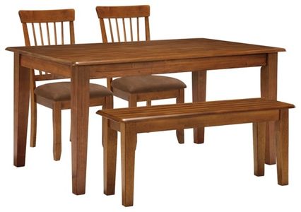 Serve up a simply striking look with this dining room table set. Clean-lined, farmhouse-inspired table is paired with four spindle-back chairs with upholstered seats and a cozy bench for a dash of something different. Rustic, hand-applied finish is a feast for the eyes.Read More