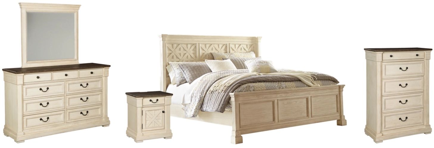 Includes California king panel bed(headboard, footboard, rails), dresser with mirror, chest of drawers and nightstand