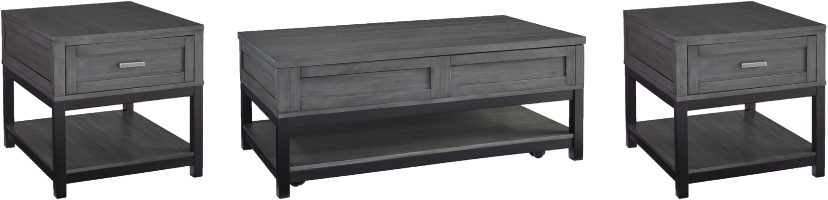 Includes coffee table and 2 end tables, Made of wood, veneers and engineered wood, Two-tone finish: grayish brown and black metallic, Coffee table with spring-lift top, shelf and casters for easy mobility, End table with smooth-gliding drawer, shelf and satin nickel-tone hardware, Assembly required