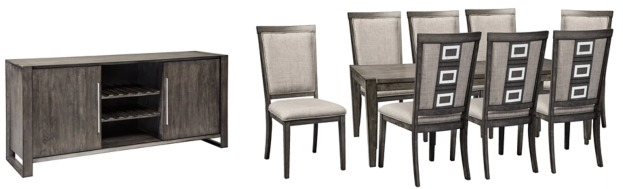 Cheers to the Chadoni 10-piece dining set for serving up high-end design, minus the attitude. The look might be ultra sleek and contemporary, but with an easy-on-the-eyes “smoky” finish, it exudes a casually cool vibe that feels at home. The server’s sliding doors with linear pulls add a dash of mid-century flair. With space for 12 wine bottles, utensil drawers and adjustable shelving, it serves your entertainment needs beautifully. Eight sleek chairs tantalize with polyester linen-weave upholstery, and sculptural metal accents infused on the chair backs add a punch of cool character.Read More