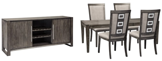 Cheers to the Chadoni 6-piece dining set for serving up high-end design, minus the attitude. The look might be ultra sleek and contemporary, but with an easy-on-the-eyes “smoky” finish, it exudes a casually cool vibe that feels at home. The server’s sliding doors with linear pulls add a dash of mid-century flair. With space for 12 wine bottles, utensil drawers and adjustable shelving, it serves your entertainment needs beautifully. Four sleek chairs tantalize with polyester linen-weave upholstery, and sculptural metal accents infused on the chair backs add a punch of cool character.Read More