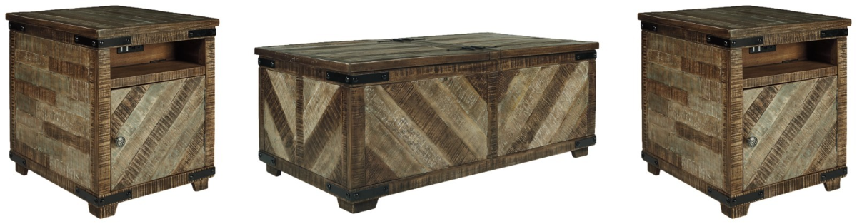 Raise the bar on modern farmhouse design with this occasional table set. Quality crafted of mango wood with a multi-tonal brown finish and casual plank style, it includes a coffee table with a unique top that opens on both sides for access to a spacious interior.Read More