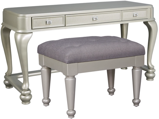 Here's to vanity in the best sense of the word. This vanity and upholstered vanity stool allures with the glitz and glam befitting silver screen queens. Exquisite frame's metallic tone channels that Hollywood Regency flair you've been dreaming of.Read More
