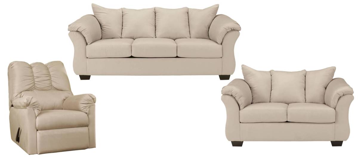 Sofa and loveseat with loose seat and attached back and armrest cushions