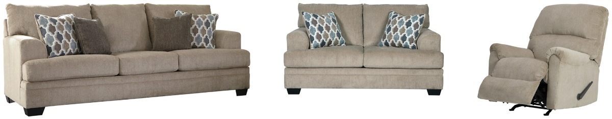 This contemporary sofa, loveseat, and rocker recliner set have comfort written all over it. From the plush cushions to the textured tan fabric, it’s a total winner for relaxation. Designer throw pillows in blue, brown and tan complement the neutral upholstery of the sofa and loveseat while the rocker recliner invites you to kick back and relax.Read More
