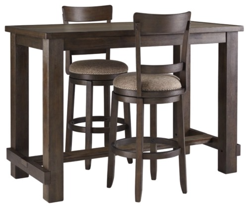 Raise the bar on modern farmhouse style with this 3-piece rectangular bar table set. Its clean-lined good looks are accentuated with bold, blocky legs and stretcher profile for a substantial look and feel. The wire-brushed finish infuses a relaxed, rustic sense of ease. Two tall swivel bar stools include comfortably curved backrests and cushioned seats covered in a textural neutral fabric.Read More