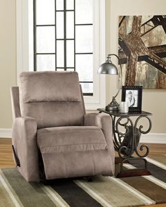 The Karrabin Recliner features a divided seatback design, plush seat cushions, and a colored accented stitching. They have a rocking and reclining mechanism that allows you to sit back, rock, and relax with this recliner! The Karrabin recliners come in either Almond, Slate, or Pecan-brown color options.Read More