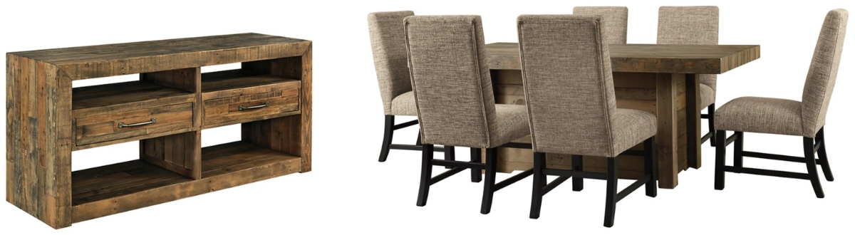 Load up on the earthy character, and scale back on fuss. As this 8-piece dining set proves: less is more. Crafted of reclaimed pine, the dining table and dining server’s chunky yet clean profiles showcase long butcher-block planking rich with tonal variation and a whole lot of raw beauty.Read More