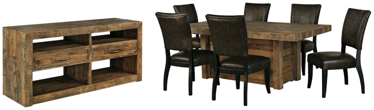 Load up on the earthy character, and scale back on fuss. As this 8-piece dining set proves: less is more. Crafted of reclaimed pine, the dining table and dining server’s chunky yet clean profiles showcase long butcher-block planking rich with tonal variation and a whole lot of raw beauty.Read More