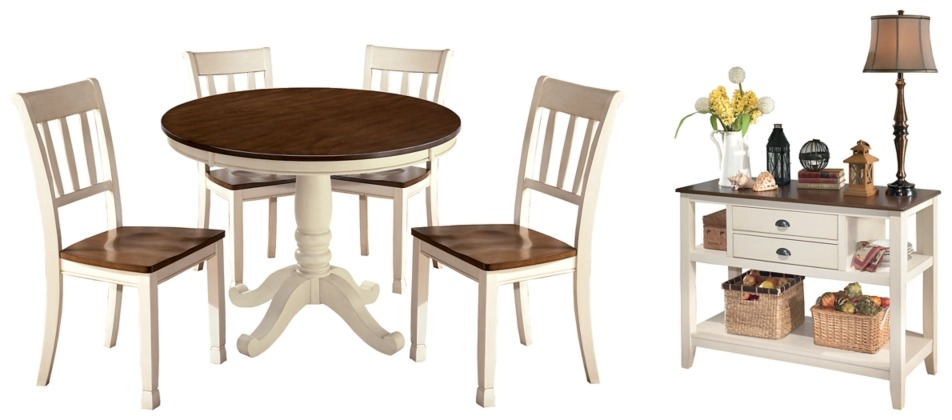 Incorporate cottage-cool warmth in your dining space with this 6-piece dining room set with round table, four rake back chairs and dining server with two-tone finish serve up twice the charm and character.Read More