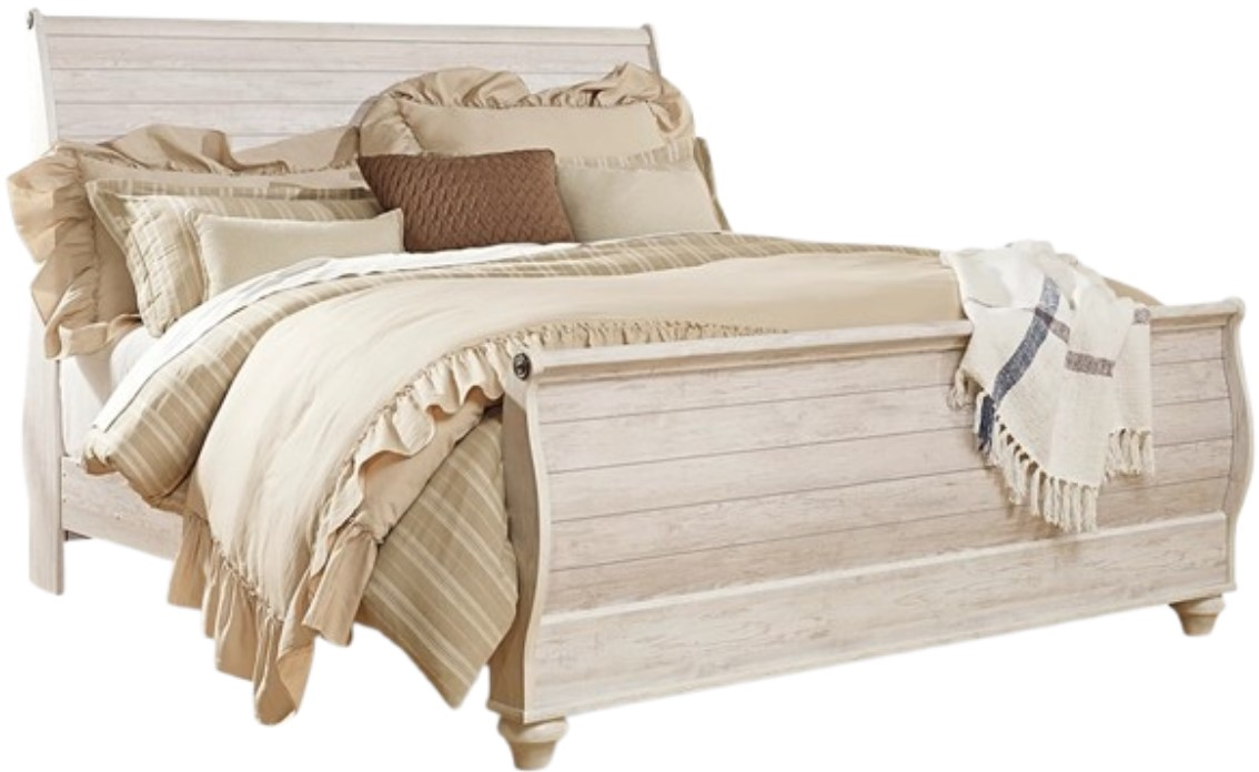The Willowton King Sleigh Bed from Signature Design by Ashley® combines coastal charm with classic elegance. Its whitewashed finish, wood-grain detailing, and gently curved headboard create a serene, beachy vibe, perfect for relaxing and elevating any bedroom space.Read More