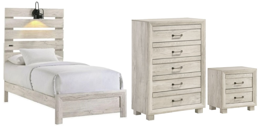 The Fort Worth Twin 3-Piece Bedroom Set in White is a farmhouse-style collection featuring charm and functionality. This set includes a slat-style twin size bed, a spacious chest, and nightstand, all designed with attention to detail and features that will bring an extra touch to your bedroom essentials.Read More