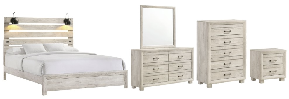 The Fort Worth King 5-Piece Bedroom Set in White is a farmhouse-style collection featuring charm and functionality. This set includes a slat-style king size bed, a spacious dresser, mirror, chest, and nightstand, all designed with attention to detail.;USB Ports in the headboard and nightstand make it easy to charge your devices.Read More