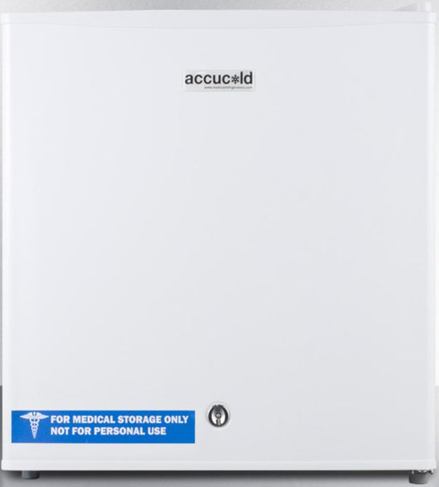 Accucold by Summit Appliance offers a competitive line of compact refrigeration designed for general purpose use in institutional settings. The FFAR24LMAN is a compact all-refrigerator that utilizes a static manual defrost cooling system. Two removable wire shelves offer storage convenience, while the seamless interior is easy to clean. This unit has a flat door liner as recommended by the CDC. An adjustable dial thermostat is located inside the unit. The FFAR24LMAN comes in a white finish, with a user-reversible door for added convenience. A factory installed lock provides added safety. This unit can be paired with the similar FS24L all-freezer to create a matching set.