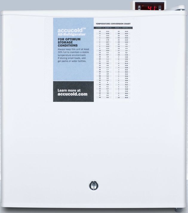 Accucold's PRO Series features all-refrigerators and all-freezers designed for reliable temperature stability in institutional settings. The FFAR24LPRO is a compact all-refrigerator sized for countertop use, with a white exterior finish. We include a factory-installed lock for keyed security. A hospital grade cord with a 'green dot' plug offers added safety in high traffic areas. This unit has a digital thermostat mounted on top of the cabinet to allow users to modify the temperature without opening the door. Inside, the FFAR24LPRO utilizes automatic defrost operation for reduced maintenance. An internal fan helps to stabilize the interior temperature from top to bottom. Adjustable wire shelves offer flexible storage. This unit includes a flat door liner as recommended by the CDC and VFC. Additional features include a factory-installed probe hole for users to install their own temperature monitoring equipment. The FFAR24LPRO can be paired with a matching all-freezer (model FS24LPRO). Additional options, including NIST calibrated temperature alarms and data loggers, can also be added. Contact our product specialists for more information.