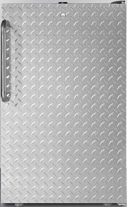 Accucold by Summit Appliance offers a wide range of ADA compliant all-refrigerators for general purpose storage. The commercially listed FF521BL7ADA Series features high performing 20" wide, 32" high all-refrigerators designed for freestanding use in commercial applications.The ETL-S listed FF521BL7DPLADA features a full 4.1 cu.ft. capacity. It has a black cabinet with a textured diamond plate wrapped door. A factory installed lock is located at the top of the door for convenient security and a polished stainless steel towel bar handle completes the modern look.Inside, this auto defrost refrigerator includes three adjustable glass shelves. A bottom crisper drawer offers added storage options. Additional features include an adjustable thermostat and a switchable interior light.At just 20" wide, the ADA compliant FF521BL7DPLADA is ideal for any space in need of quality cooling and can be perfectly matched with our FS408BL7DPLADA all-freezer. This model is designed for freestanding commercial use. For a built-in version of this model, see the FF521BLBI7ADA.