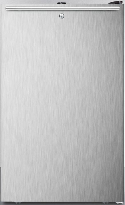 Accucold by Summit Appliance offers a wide range of counter height refrigerator-freezers for general purpose storage. The CM421BL Series features high performing 20" wide units designed for freestanding use.Sized at just under 20" wide, the CM421BLSSHH is designed for freestanding use. It has a black cabinet with a 304 grade stainless steel wrapped door and sleek horizontal handle for a modern look. A top-mounted lock offers convenient security. The manual defrost interior includes adjustable glass shelves, a clear crisper drawer and an ice cube compartment for convenient storage. This unit includes an interior light with an on/off rocker switch.With easy-fitting dimensions and user-friendly features, the CM421BLSSHH is ideal for any general purpose setting in need of a reliable refrigerator-freezer.