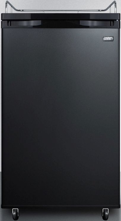 Summit Appliance offers a versatile line of full-sized freestanding beer dispensers designed for low maintenance storage. The SBC582BNK features a large interior that can hold a full half, quarter, 0.17" or mini keg. It comes in a jet black finish ideal for any setting. The surface includes a removable drip tray to collect spills and a chrome guard rail to help keep glasses and mugs in place. We include a set of locking casters for easy mobility. The user-reversible door swing makes it easy to accommodate any location’s setup. Automatic defrost operation ensures minimum user maintenance inside the 4.9 cu.ft. interior. Brackets are included to mount your CO2 tank (not included) in the rear of the beer dispenser, freeing up added storage space inside. A dial thermostat ensures easy temperature management. Two adjustable shelves are included to allow alternate storage options. This unit is designed for freestanding use and does not ship with any tapping equipment, allowing users to customize with their own tap kits. To order with a complete American Sankey tap kit, see the SBC582B.