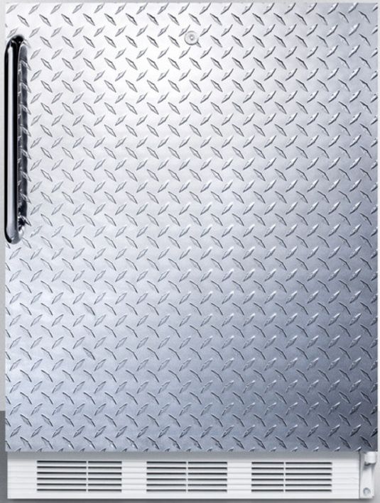 Accucold by Summit Appliance offers a wide range of counter height refrigeration for general purpose storage. The AL650 Series includes freestanding refrigerator-freezers designed for optimum storage conditions and sized for use in settings complying with ADA guidelines.At 32" high, the AL650LDPL is designed for freestanding use in ADA compliant facilities. The 24" footprint offers over 5 cu.ft. of storage capacity. This model features a white cabinet and a diamond plate door in wrapped aluminum with a factory installed lock. A curved towel bar handle in polished stainless steel completes the look.Inside, our unique dual evaporator system separately cools the refrigerator and freezer sections to ensure proper storage temperature. Cycle defrost operation reduces user maintenance in the automatic defrost fresh food section, while the manual defrost freezer compartment can maintain zero degrees. Door storage provides easy access for tall bottles and small condiments. Additional features include adjustable shelves, a clear crisper, and automatic interior lighting.The AL650LDPL has long proven itself to have one of the best temperature performance records in the industry. To see additional finish options on this unit, browse the full AL650 Series. For built-in undercounter applications, see the AL650LBIDPL. NOTE: This unit is designed for general purpose, medical, or commercial applications and does not meet DOE energy standards for residential use.