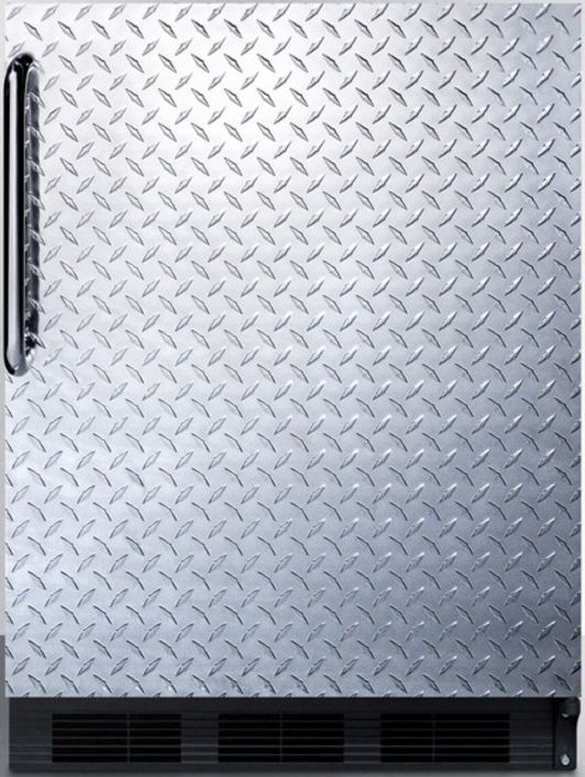 Accucold by Summit Appliance offers a wide range of counter height refrigeration for general purpose storage. The CT66J Series includes freestanding refrigerator-freezers equipped with dual evaporator cooling for optimum storage conditions.Sized with a 24" footprint, the CT66BDPL offers over 5 cu.ft. of storage capacity. This counter height model is designed for freestanding use. It has a black cabinet and diamond plate textured door in wrapped aluminum. A curved towel bar handle in polished stainless steel completes the industrial look.Inside, our unique dual evaporator system separately cools the refrigerator and freezer sections to ensure proper storage temperature. Cycle defrost operation reduces user maintenance in the automatic defrost fresh food section, with static manual defrost operation in the freezer compartment. Door storage provides easy access for tall bottles and small condiments. Additional features include adjustable glass shelves, a clear crisper, and automatic interior lighting.The CT66BDPL has long proven itself to have one of the best temperature performance records in the industry. To see additional finish options on this unit, browse the full CT66 Series. For built-in undercounter applications, see the CT66BBIDPL.NOTE: This unit is designed for general purpose, medical, or commercial applications and does not meet DOE energy standards for residential use.
