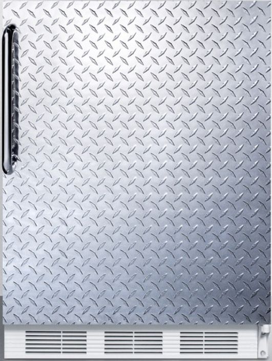 Accucold by Summit Appliance offers a wide range of counter height refrigeration for general purpose storage. The CT66JADA Series includes freestanding refrigerator-freezers designed for optimum storage conditions and sized for use in settings complying with ADA guidelines.At 32" high, the CT66JDPLADA is designed for freestanding use in ADA compliant facilities. The 24" footprint offers over 5 cu.ft. of storage capacity. This model features a white cabinet and a diamond plate door in wrapped aluminum. A curved towel bar handle in polished stainless steel completes the look.Inside, our unique dual evaporator system separately cools the refrigerator and freezer sections to ensure proper storage temperature. Cycle defrost operation reduces user maintenance in the automatic defrost fresh food section, while the manual defrost freezer compartment can maintain zero degrees. Door storage provides easy access for tall bottles and small condiments. Additional features include adjustable shelves, a clear crisper, and automatic interior lighting.The CT66JDPLADA has long proven itself to have one of the best temperature performance records in the industry. To see additional finish options on this unit, browse the full CT66JADA Series. For built-in undercounter applications, see the CT66JBIDPLADA.NOTE: This unit is designed for general purpose, medical, or commercial applications and does not meet DOE energy standards for residential use.