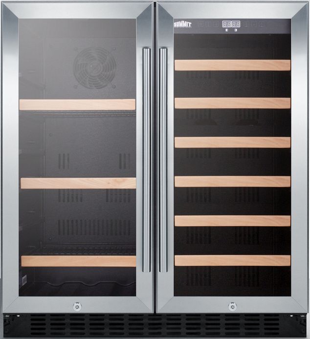 SUMMIT's collection of built-in undercounter wine cellars offers quality storage with user-friendly convenience and elegant style. Front locks offer keyed security for both compartments. The sealed back design ensures easier cleanability. Two separate zones feature independent digital thermostats, allowing you to store craft beer or white wine in the left side while preserving your red wine in the right. The left beverage compartment includes three slide-out black wire shelves with wooden trim to match the six wooden shelves included in the right. Both sections feature a slotted floor to hold additional bottles. The digital control panel features an LED temperature readout in Celsius or Fahrenheit. Recessed LED lighting in a white hue offers an attractive and efficient presentation. With its attractive style and user-friendly features, the SWBV3071 is a great addition to any home looking to bring versatile beverage storage under the counter.