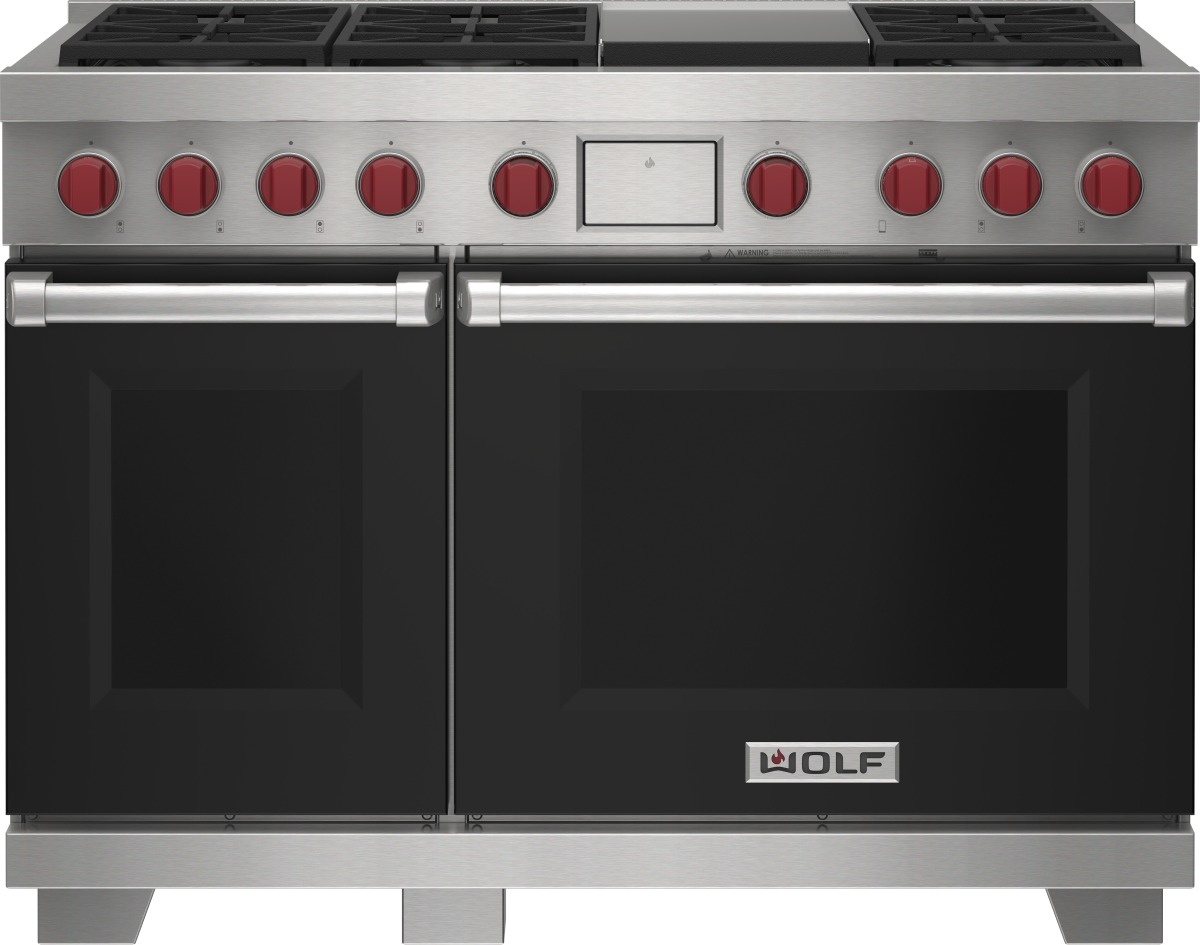 Wolf® 48" Black Freestanding Dual Fuel Range and Infrared Griddle features dual-stacked, sealed burners, Dual VertiFlow™ convection system, Gourmet Mode, 10 chef-created cooking modes, LED backlit control bezels, self-clean, delayed start, timed cook, and Sabbath features.Read More