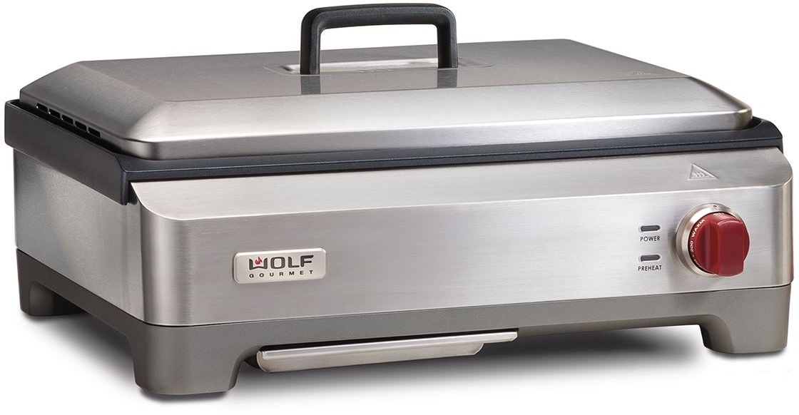 The Wolf Gourmet griddle is designed with a thick, cast aluminum cooking surface mirroring the precision, quality and look of a Wolf built-in griddle. The 12 by 17 inch professional-grade surface offers superior nonstick coating, and a 1/2 inch deep rim adds more control while turning or stirring your favorite foods.